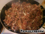 Обжарить смесь фарша и лука (фарш предварительно смешать с маринадом), потушить 5 минут под крышкой. -