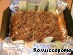 Форму для запекания застелить фольгой, выложить цукини, затем фарш.