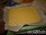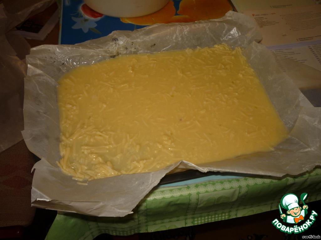 Вылить смесь в форму, покрытую пергаментом. Поставить в духовку и выпекать до золотистого цвета (примерно минут 10-15).