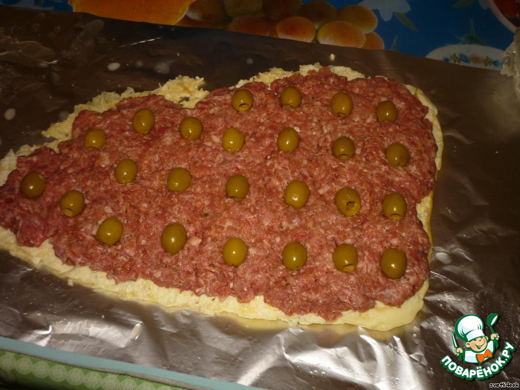 Расстелить лист фольги, смазать его растительным маслом. Аккуратно переложить на него приготовленный омлет. Сверху ровным слоем выложить фарш и разложить маслины (я использовала оливки).