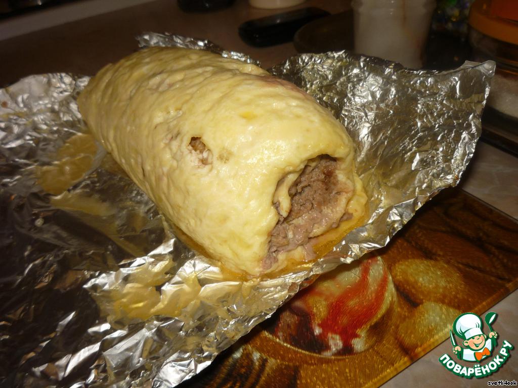 Свернуть в рулет, завернуть его в фольгу и отправить в духовку, нагретую до 190 градусов, на 30 минут.