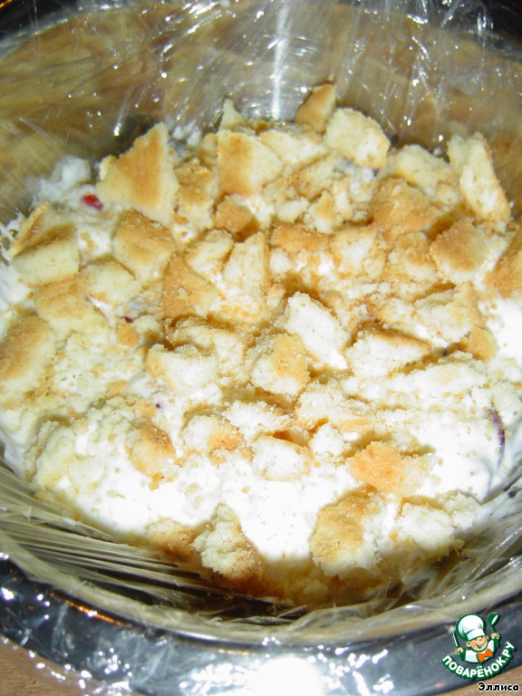 Затем тонкий слой творожно-сметанной массы, на него слой измельченного бисквитного печенья,