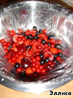 Глубокую миску застилаем пищевой пленкой и на дно выкладываем ягоды,