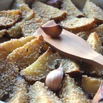 Чеснок очистить от верхнего (несъедобного) слоя и нарезать тонкими пластинками (можно и не резать). Уложить между картофелинами в форму, отправить в духовку и запекать при 180 град. минут 30 до золотистого цвета.