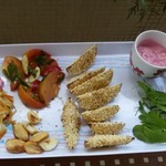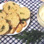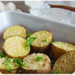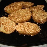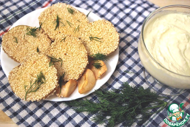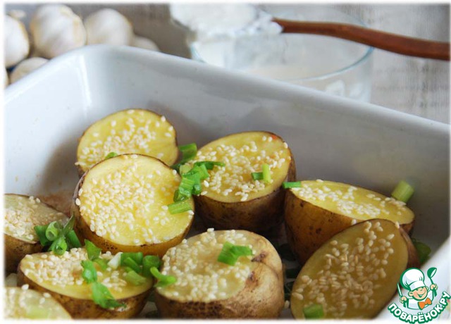 Молодой картофель, запеченный с чесноком и кунжутом со сметанным соусом. Поверьте, это очень вкусно! Рекомендую!