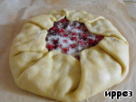 Закрыть пирог краями теста, оставить открытой середину и посыпать оставшимся сахаром тесто (я забыла это сделать).