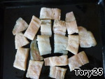 Филе любой рыбы режем на кубики и укладываем на смазанный маслом противень, солим по вкусу и перчим,