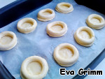Вырезаем волованы и выпекаем до румяности (у меня они не поднялись почти, так как я торопилась и до конца тесто, видимо, не разморозилось). Вырезаем так: из листа теста вырежем круги (я вырезала рюмкой) и потом из кружочков вырезаем серединку (это я делала половинкой упаковки от зубочисток)... Вырезанную серединку пальцами разминаем до диаметра получившегося кольца - это будет дно... На донышко кладем колечко, и получается вот такой "колодец"