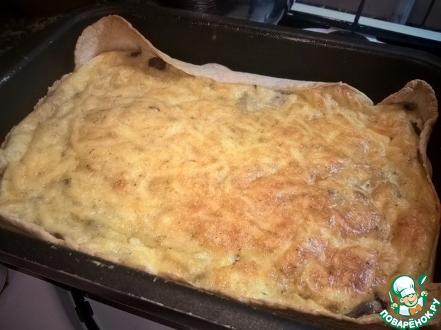 • + сливки, грибы, 2/3 подготовленного сыра и специи по вкусу.. хорошо перемешать. Тесто вложить на дно формы и вылить в нее смесь
