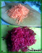Чистим морковь и свеклу, трем на крупной терке. Обжариваем по отдельности.