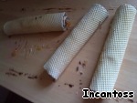 Аккуратно сворачиваем каждый лист отдельным рулетом, заворачиваем в пищевую плёнку и - в холодильник часика на два.