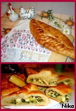 Из второй части теста сделать один большой пирог. Начинка из зелёного лука,яиц и укропа
