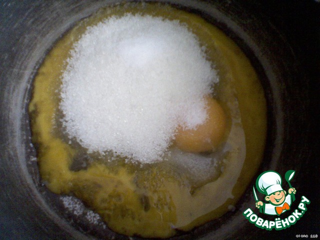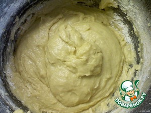 Желтки растереть с сахаром, солью, ванильным сахаром и растопленным сливочным маслом.