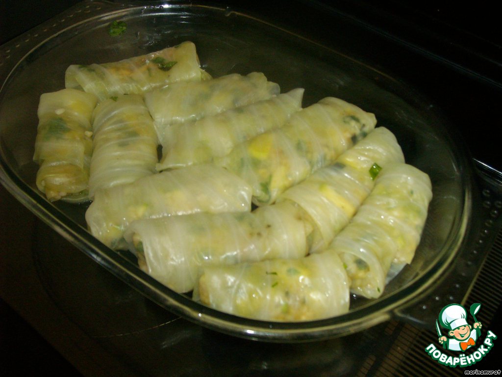 На капустный лист выкладываем начинку, сворачиваем и выкладываем в посуду.