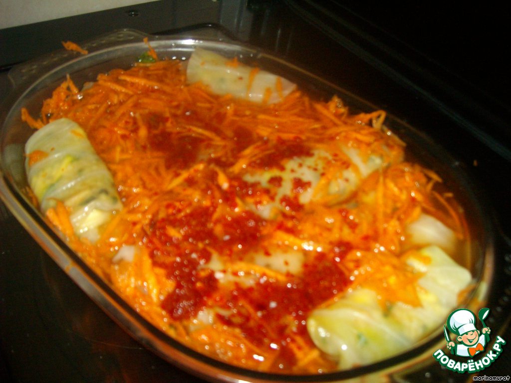 Разводим в воде пасту, все добавляем к голубцам, накрываем крышкой и ставим в духовку, разогретую до 200*C на 40 минут. -