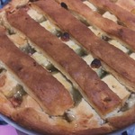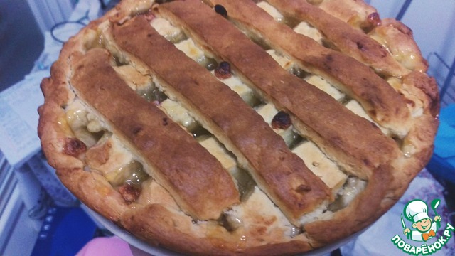 Большую часть теста раскатать, положить в форму, сделав высокие бортики, посыпать слегка крахмалом, намазать половинным количеством начинки.