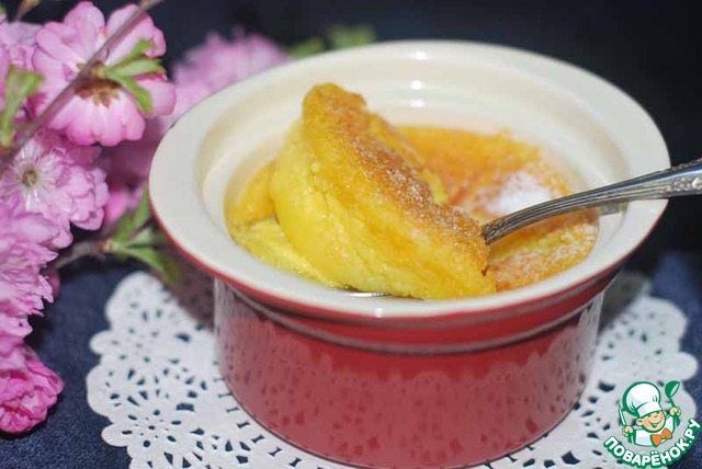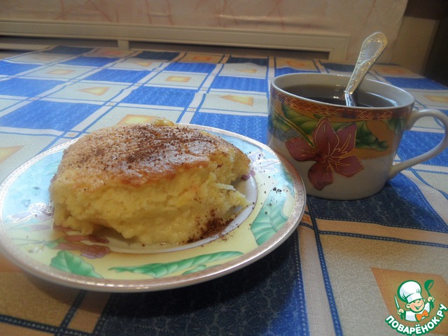 Десерт получается трехслойным: внизу слой теста, внутри нежный крем, а сверху пенистая корочка. Это удивительно, учитывая то, что мы смешали все ингредиенты в одной емкости.
