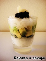 Номер три: мелко нарезанное авокадо. Сверху — немного чёрной икры мойвы и листочек маринованного имбиря.