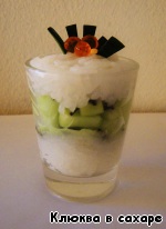 Номер пять: мелко нарезанный свежий огурец (предварительно очищенный от кожицы). Сверху украшаем срезанной огуречной кожицей и несколькими икринками лососёвой икры.