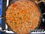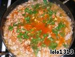 затем добавить томат-пасту, зелень петрушки, соль, перец, немного воды и оставить на огне до полнейшего выпаривания жидкости.
