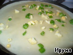 Одно яйцо отвариваем вкрутую (10 минут с момента закипания), охлаждаем в холодной воде, очищаем от скорлупы и режем мелкими кубиками. Зеленый лук моем, обсушиваем бумажными полотенцами и режем мелкими колечками. Аккуратно смешиваем с яйцами, немного присолить.