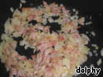 В кастрюле разогрейте оливковое и сливочное масло. Добавьте бекон и обжарьте до золотистого цвета.