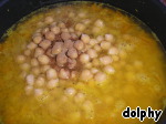 Добавьте к луку-порею и моркови сок, бульон, нут и смесь специй. Доведите до кипения, уменьшите огонь и поварите, накрыв крышкой, 15 минут.