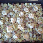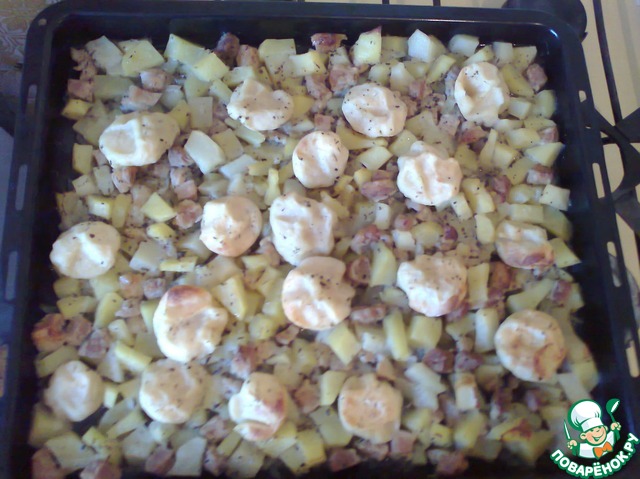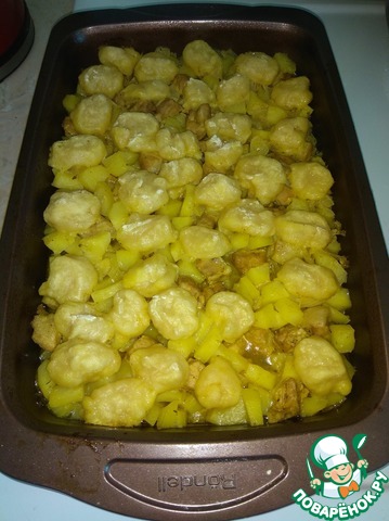 Выкладываем нудли сверху на картофель и плотно накрываем крышкой, ставим в духовку на 40 минут при температуре 200-230 градусов.