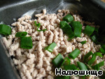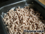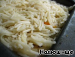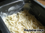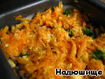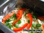Смазываем глубокую форму для запекания сливочным маслом и начинаем выкладывать продукты слоями. Сначала вермишель.