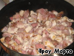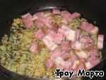 Когда лук станет золотистым, добавить нарезанный кубиками бекон. Пожарить 10 минут.