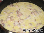 Добавить к луку и бекону нарезанную кусочками куриную грудку. Тушим до готовности курицы на медленном огне.