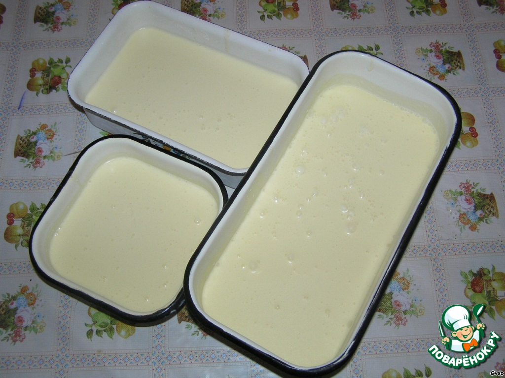 Предварительно нужно замочить желатин на 40 мин. Две пачки желатина залить двумя стаканами воды. Поставить на плиту и довести до кипения. Забыла снять, как взбивала, но там всё просто. Творог, желтки, масло и сахар взбивать 15 мин. Добавить остывший желатин, размешать и разлить по формам. Поставить в холодильник до застывания.