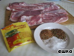 • Вот продукты которые нам понадобятся. С грудинки я сняла шкурку и срезала ребрышки.