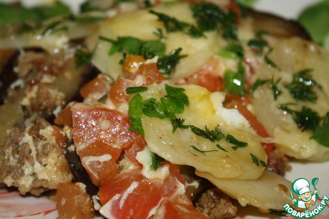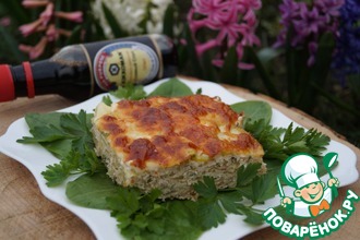 Запекать в духовке при температуре 180-200 градусов, полчаса. За 10 мин до готовности залить взбитыми яйцами с молоком и посыпать тертым сыром.