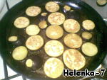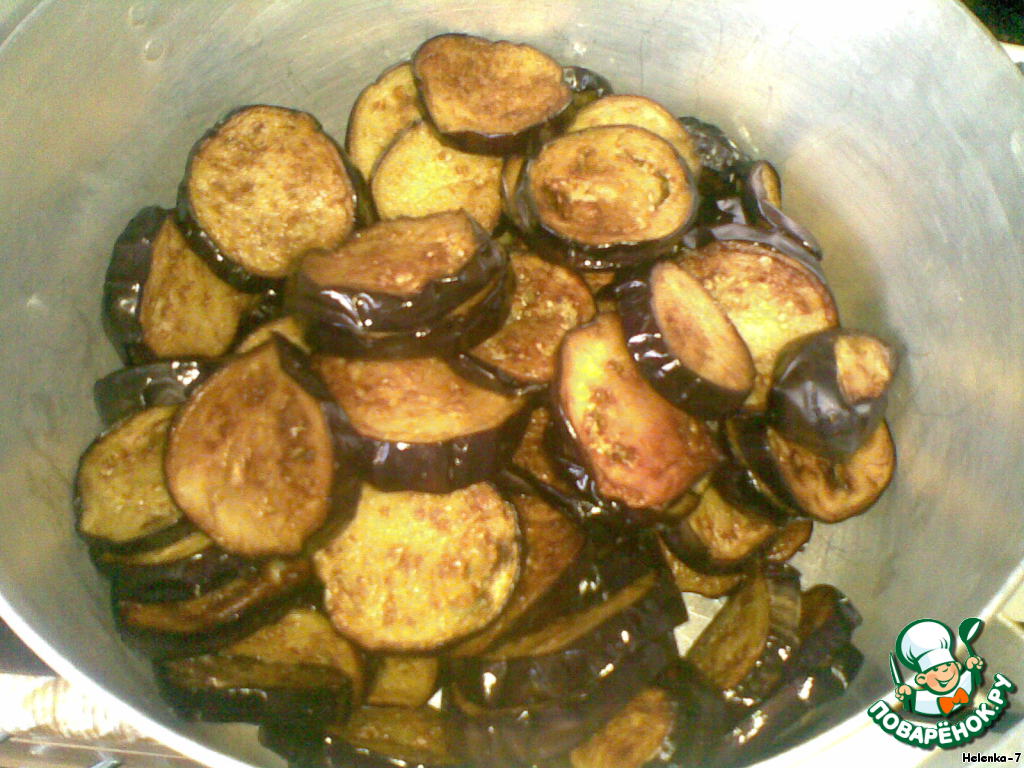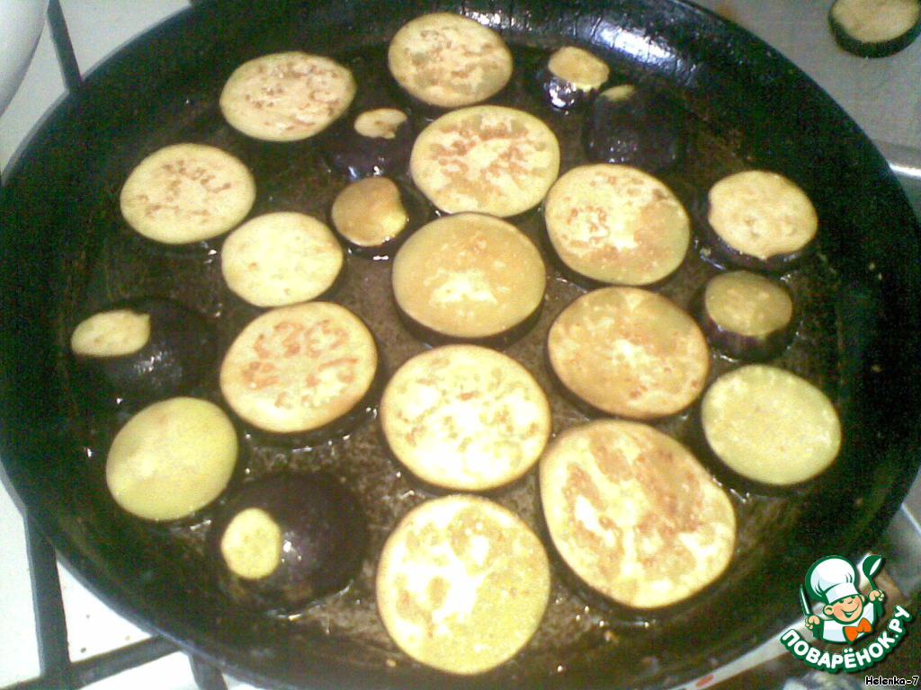 • Баклажаны вымыть, порезать кружочками, чуть-чуть посолить. Дать постоять 1 час, чтобы ушла горечь. Обжарить по растительном масле