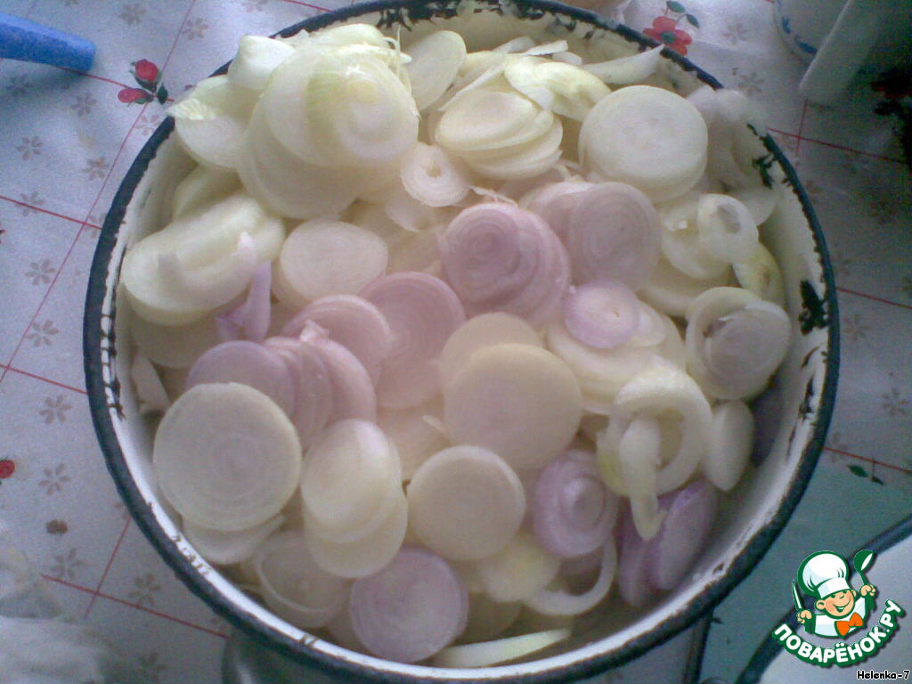 • Лук порезать кольцами, но не очень тонко, а то он распадется.