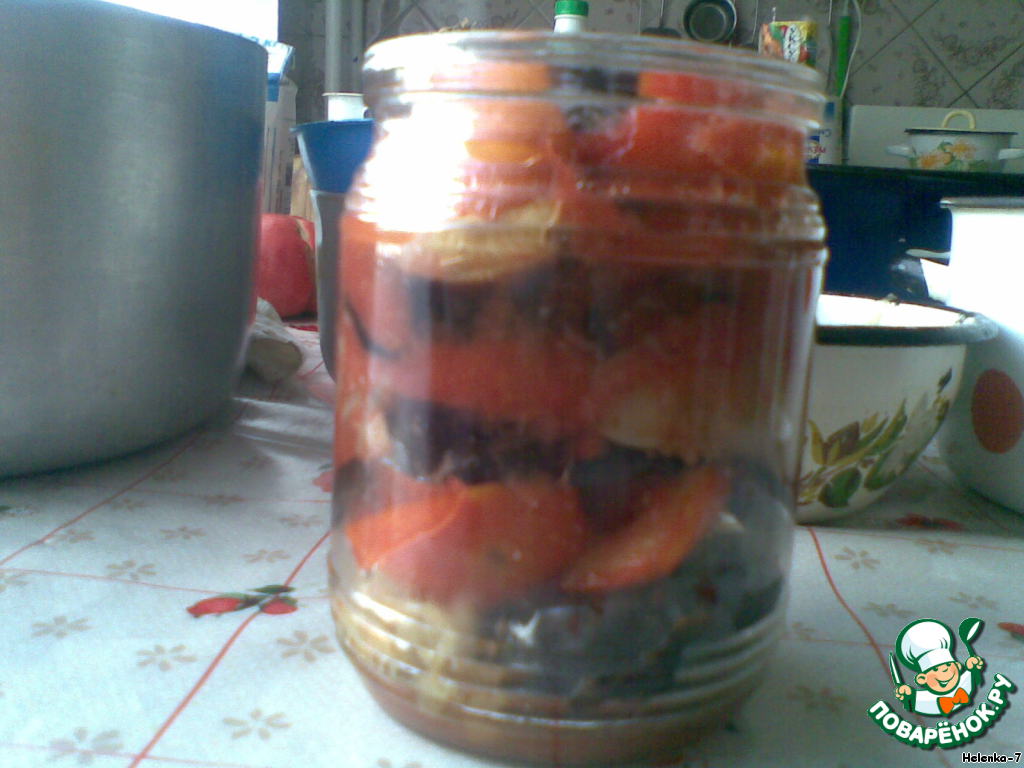 • В стерилизованные баночки (я предпочитаю поллитровые, как раз хватает на один обед или ужин для семьи) слоями сложить баклажаны, лук, помидоры. Залить томатным соком со специями. Стерилизовать 1,5 часа (при условии, что хранить придется в жаркой квартире). Если есть возможность хранить хотя бы при 20-22 градусах, то можно обойтись и 20 минутами.
