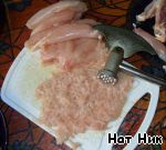 Куриную грудку отделить от кости, мясо отбить как на отбивные, посолить, поперчить, порезать на небольшие кусочки.