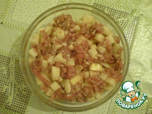 Лук нарезать кубиками и смешать с мясом и картошкой, добавить соль, перец по вкусу, приправу какую любите, я положила лавр и тмин - они хорошо сочетаются с картофелем, но Вы можете использовать ту, какую любите.