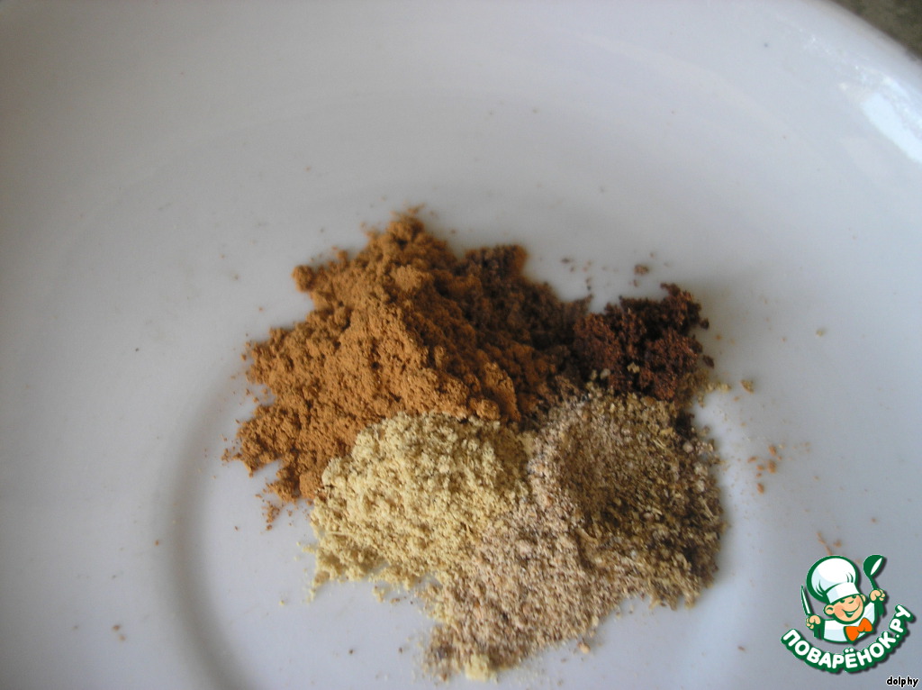 - Специи (корица, мускатный орех, гвоздика, душистый перец, имбирь, кориандр, гвоздика) — 2 ч. л.