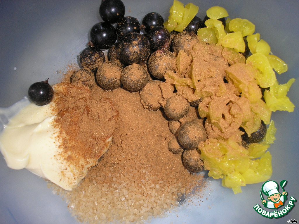 В миску положите масло, коричневый сахар, цукаты, смородину и специи.