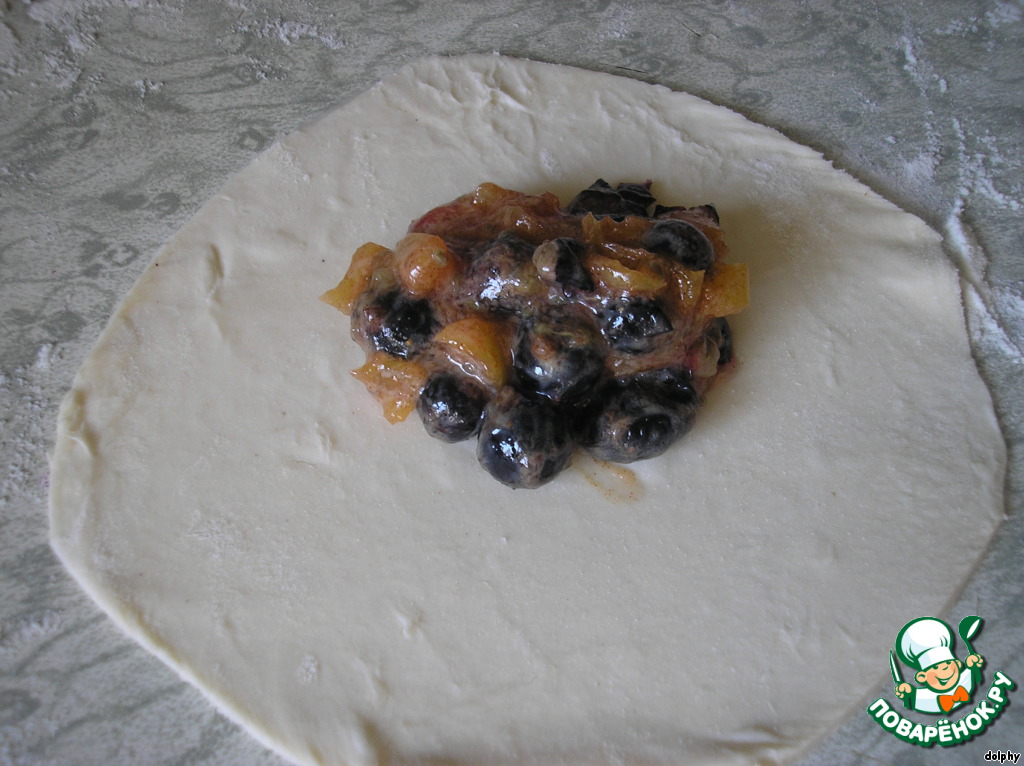 Тесто немного раскатайте и вырежьте из него 12 кружков диаметром 10 см. На середину положите 2 чайные ложки начинки.