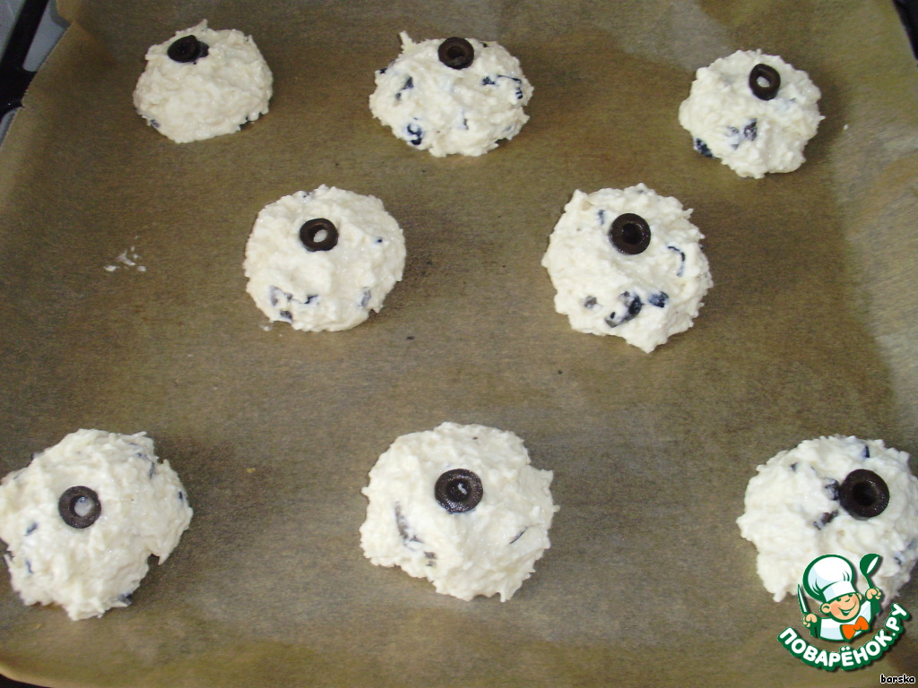 Принцип такой же: замесить тесто (мука, сода, соль,натёртые сыры, йогурт), добавить порезанные маслины -