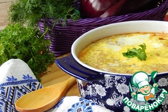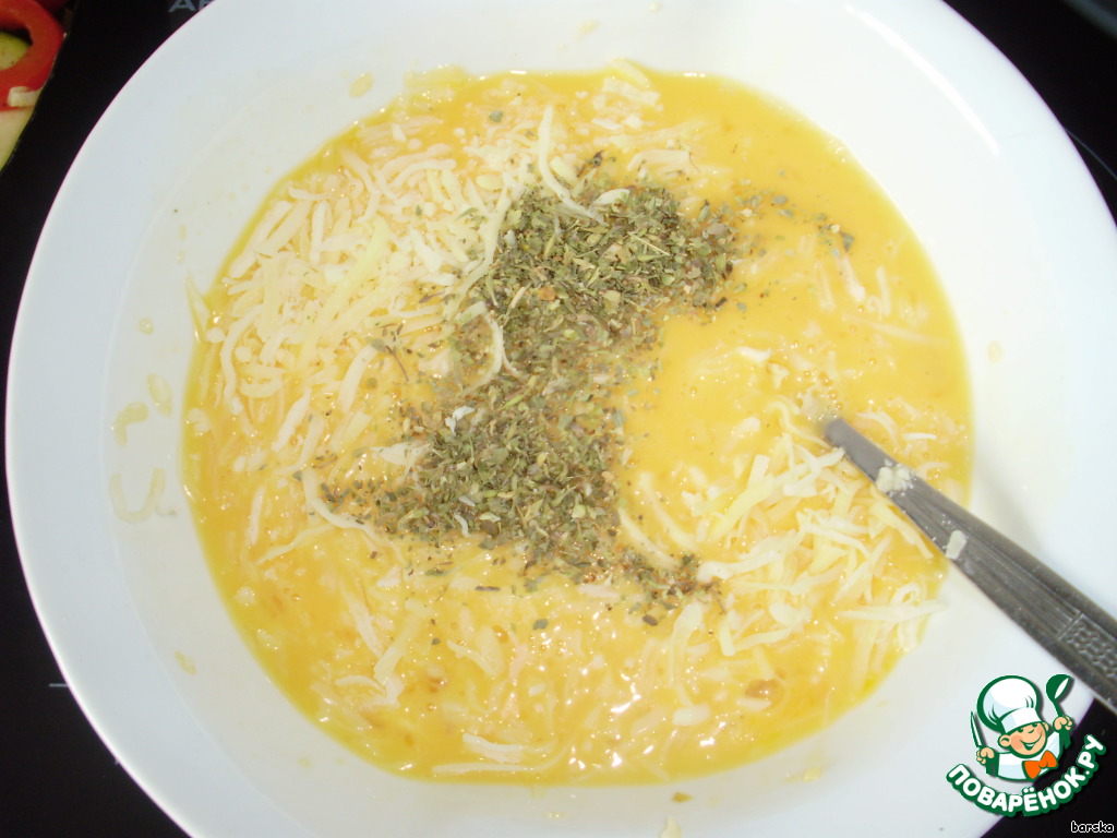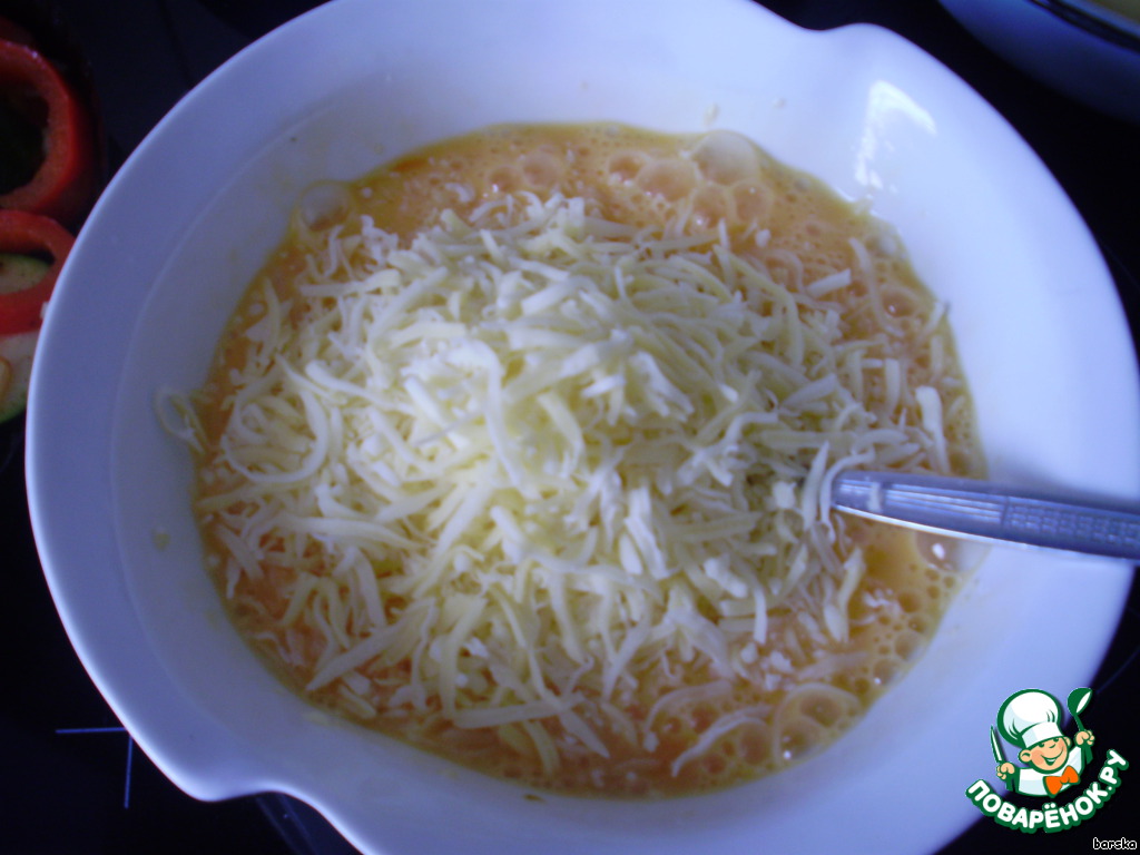 Смазать форму маслом, выложить тушеные овощи, залить сырно-яичной смесью.
