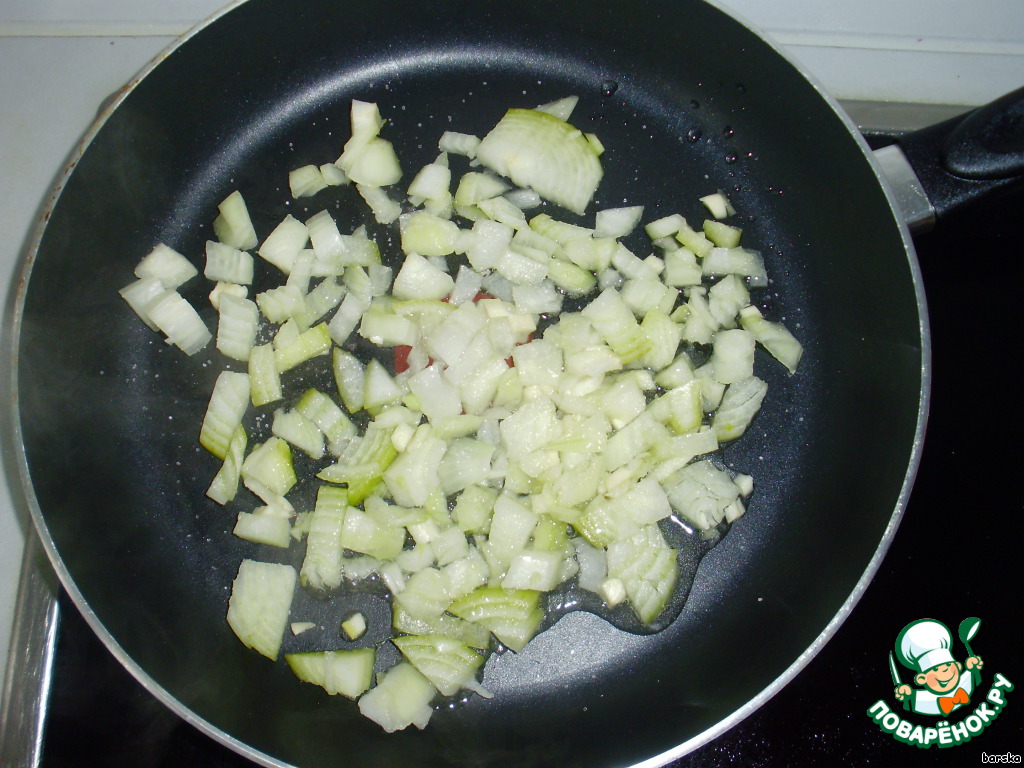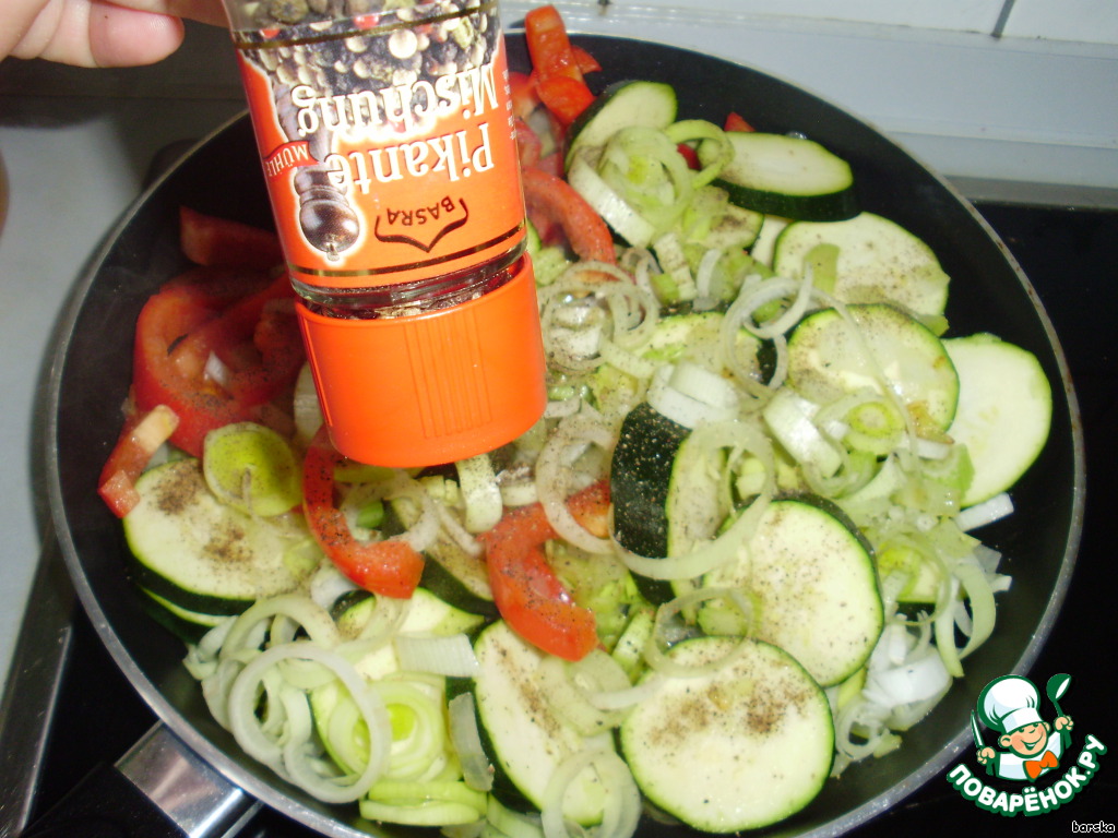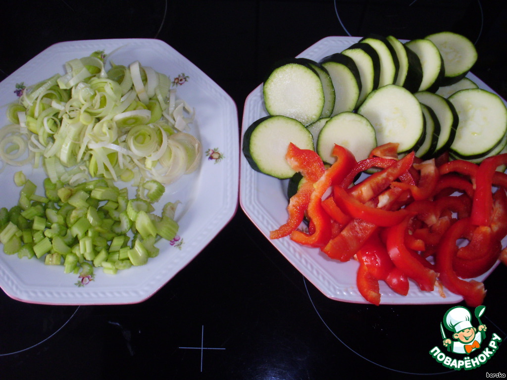 Нарезать овощи: цуккини - кружочками, перец - дольками, лук порей - кольцами, черешковый сельдерей - кусочками