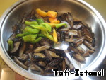 Жгучий перец режу кусочками, но салат будет очень острый, если не хотите сильно острый. после жарки можете удалить кусочки перца, или замените болгарским. Жарю на подсолнечном масле, потом добавляю баклажаны и вместе прожариваю.