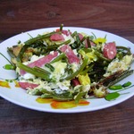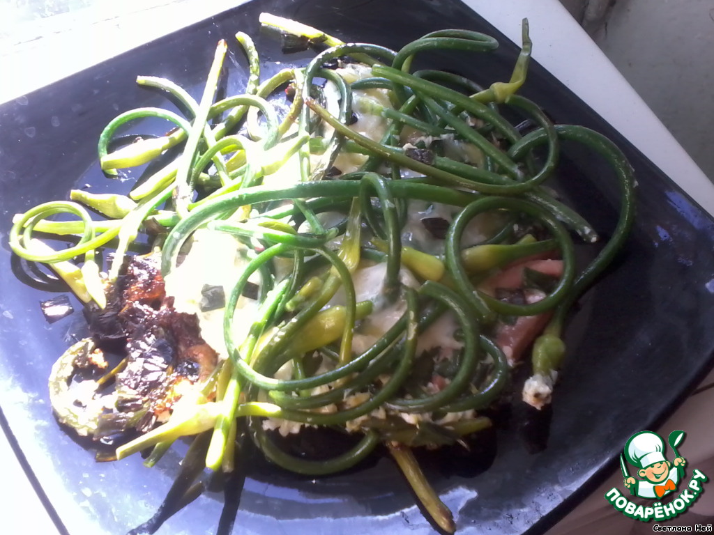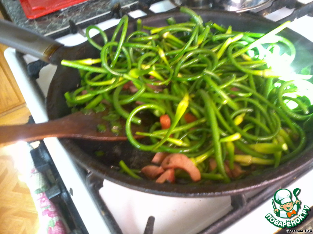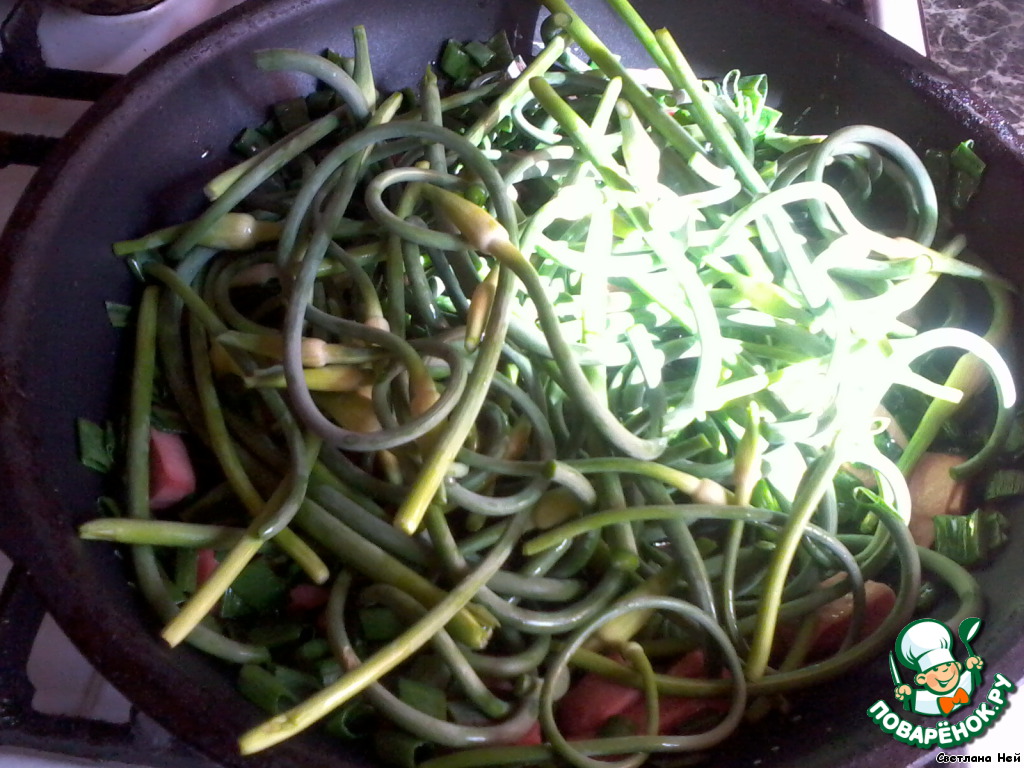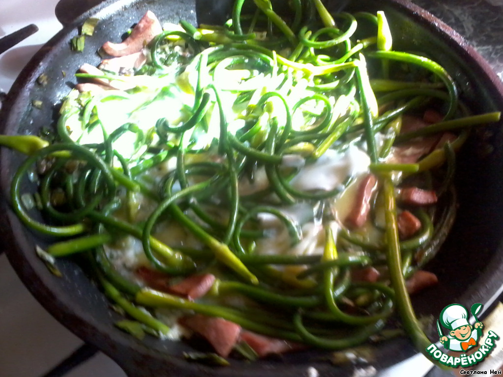 Нарезать лук зеленый мелко, ветчину. Обжарить их и сверху положить чесночные стрелки.