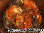 На растительном масле обжариваем вторую половинку луковицы, нарезанную относительно тонкими полукольцами, вместе с луком зажаривается и порубленный чеснок. Как только лук приобретёт желтоватый оттенок, мы добавляем мелко порезанный помидор без кожицы.