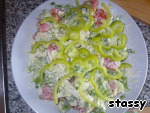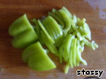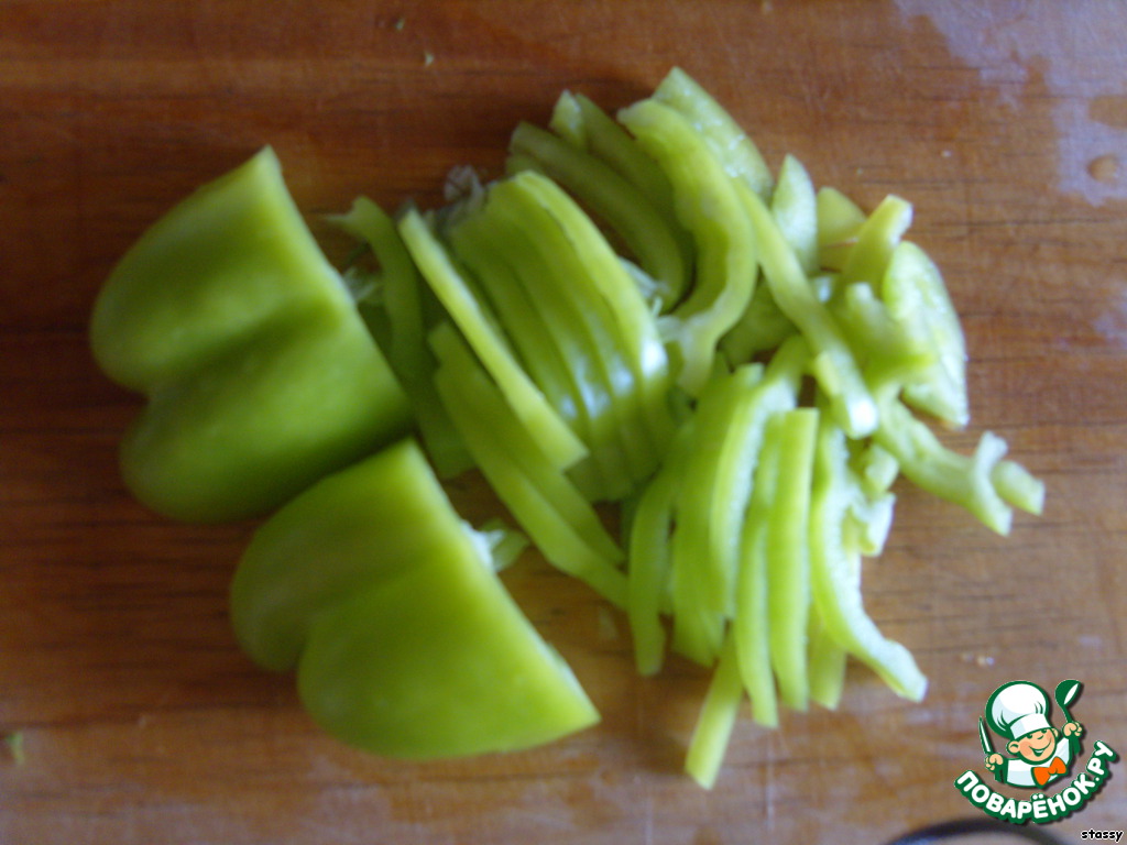 Болгарский перец нарезаем тонкими полосками, можно оставить немного для украшения салата