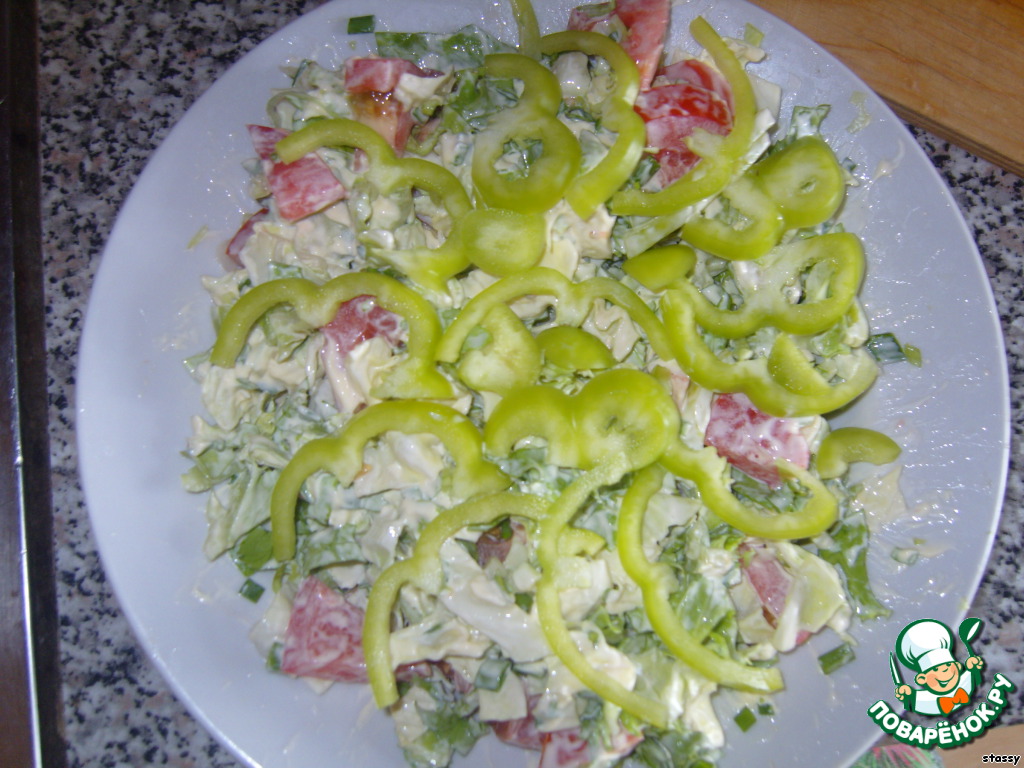 Лeгкий летний салатик. Собрала всe, что было овощного в холодильнике, и вот что получилось... Семья одобрила. Поискала на сайте, вроде бы такого пока нет.